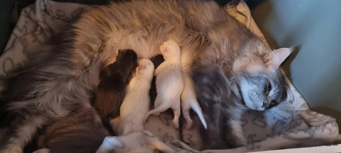 On 27/3-2024 at 05:40 the first kitten in our A-litter was born. Six kittens in total, four males and two females. They will be named after the popular Disney movie Aristocat's, we will see who gets which name later. We are extremely happy that everything has gone well and that all the kittens and mother Kelsie are doing great.